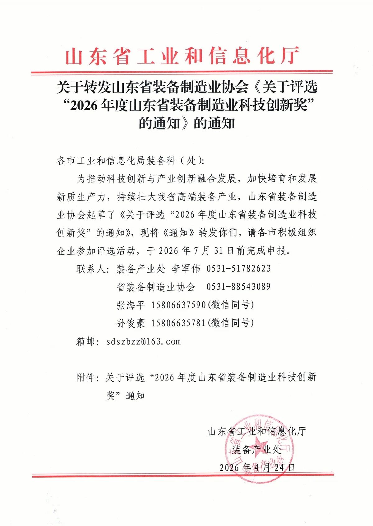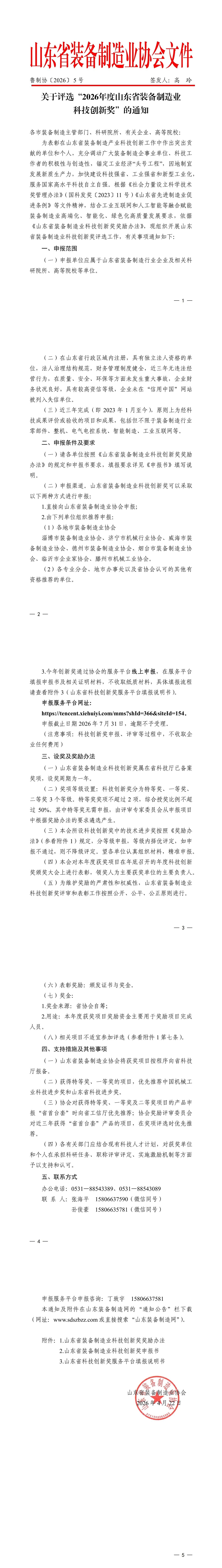 关于评选“2026年度山东省装备制造业科技创新奖”的通知
