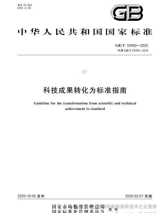 近日,国家市场监督管理总局、国家标准化管理委员会正式发布了GB/T33450-2025《科技成果转化为标准指南》,该标准将替代2016年版旧标,于2026年2月1日正式实施,为科技成果转化为标准提供了更科学、更细致的通用技术路径。 一、先搞懂:新版指南 “管什么”? 在聊具体内容前,先明确两个核心问题 —— 这份指南的适用范围,以及我们常说的 “科技成果”“标准”,在新版里有哪些明确定义? 1. 适用范围 指南适用于基于科技成果研制标准的所有活动,无论是企业想把专有技术变成企业标准,还是科研机构想将共性技术升级为国家标准、国际标准,都能从中找到指导。 2. 关键术语新定义 • 科技成果:通过科学研究与技术开发所产生的具有实用价值的成果(来源:GB/T39057-2020)。简单说,不是 “纸上谈兵” 的理论,而是能解决实际问题的技术成果。 • 标准:通过标准化活动,按规定程序协商一致制定,为活动或结果提供规则、指南或特性,供共同使用和重复使用的文件。新版特别强调:标准需以 “科学、技术和经验的综合成果” 为基础,且涵盖国际标准、区域标准、国家标准、行业标准、团体标准、企业标准等多个层级。 二、核心流程:科技成果转标准,四步走稳不迷路 新版指南最核心的价值,是把 “科技成果转标准” 的过程拆解为需求分析、可行性分析、可行性评估、确定标准类型与内容四大关键环节,每个环节都有明确的考量维度。 第一步:需求分析 —— 先判断 “要不要转” 需求分析是 “入门关”,重点评估转化的必要性,至少要考虑这些因素: • 行业 / 企业推广新技术、新工艺、新材料、新产品的需求; • 提升产品 / 服务质量、树立品牌、扩大影响力的需求; • 保障消费者权益、环保、安全健康等社会公益需求; • 突破国际贸易技术性壁垒、参与国际规则制定的需求。 如果连 “为什么转” 都不明确,后续工作就无从谈起。 第二步:可行性分析 —— 再看 “能不能转” 这一步是核心,要从 4 个维度全面评估科技成果的 “转化潜力”: 1. 技术属性分类:你的成果属于哪一类? 新版指南将科技成果按技术属性分为 3 类,分类直接影响后续标准类型选择: • 公益技术:服务公共利益,如地震勘探、气象监测、司法鉴定技术; • 共性技术:跨行业通用,如智能制造、纳米技术、芯片技术; • 专有技术:特定领域专用,如特高电压技术、油气勘探技术、高速铁路技术。 2. 标准特征匹配:成果有没有 “标准相”? 科技成果要转标准,必须具备4个特征: • 共同使用性:在企业、行业、全国等一定范围内能被共同使用; • 重复使用性:能反复用于同类活动,不是 “一次性” 技术; • 创新实用性:有创新性,还能解决实际问题; • 产业匹配性:属于国家支持、有优势的产业领域。 3. 技术价值评估:成果 “含金量” 如何? • 一般条件:看成果的生命周期(成熟期更易转)、推广范围、安全稳定性、对行业技术进步的推动作用; • 特殊条件(针对高新技术):是否解决领域难题、是否达到国际领先、能否与现有产业链整合、有没有成本 / 价格优势。 4. 推广前景 + 协调性:未来能走多远? • 推广前景:评估成果的竞争力(被替代风险、成本)、所属产业的成长性、市场需求规模、对经济 / 社会的带动作用(如提升生产率、优化产业结构); • 协调性:重点看与国内现行标准、国际 / 区域标准是否冲突,是否符合国际标准演进方向(避免 “闭门造车”)。 第三步:可行性评估 —— 用指标 “量化打分” 新版指南新增了第6章 “可行性评估” ,这是2016版没有的核心改进!评估指标分两类: • 筛选性指标:一票否决!包括 “成果形式是否适合转标准”“是否已被转化为标准(避免重复)”; • 竞争性指标:量化评分,涵盖 “成果性质、技术价值、推广应用前景、协调性”4 个准则层,下设 20 个要素、34 个具体指标(详见附录 A),比如 “技术领先程度”“市场需求迫切性”“与国际标准协调性” 等,通过专家评分法(优 / 良 / 中 / 差)给出综合结论。 第四步:确定标准类型与内容 —— 明确 “转成哪类标准” 根据前面的分析,就能确定标准类型了,新版指南给出了清晰的选择逻辑: 按适用范围选: • 企业内用→企业标准; • 地方特色、无市场壁垒→地方标准; • 社会组织 / 产业联盟用→团体标准; • 行业内通用→行业标准; • 跨行业 / 全国通用(公益 / 共性技术)→国家标准; • 国际领先技术→国际标准(ISO/IEC/ITU 等)。 按约束力选: • 涉及人身健康、安全、环保等→强制性国家标准; • 其他情况→推荐性国标、行业标准、地方标准、团体标准、企业标准。 按技术成熟度选: • 技术仍在发展中(如新技术、新材料)→国家标准化指导性技术文件(引导发展); • 实施效果好的团体标准→可升级为地方 / 行业 / 国家标准。 第五步:编写内容 —— 按规范 “落地成稿” 标准不是 “随便写写”,要符合格式和程序要求: • 国内标准:编写格式需符合 GB/T1.1(标准化工作导则),术语标准、符号标准、产品标准等还要分别符合 GB/T20001 系列、GB/T28222 等; • 国际标准:按 ISO/IEC/ITU 等国际组织的规定编写; • 编制说明:必须包含背景、技术依据、试验验证报告、与国际标准对比、专利说明等核心内容,还要附上成果的技术性能描述、检验报告等材料。 三、新版 vs 旧版:这些重要变化要关注 相比2016版,2025版的改进非