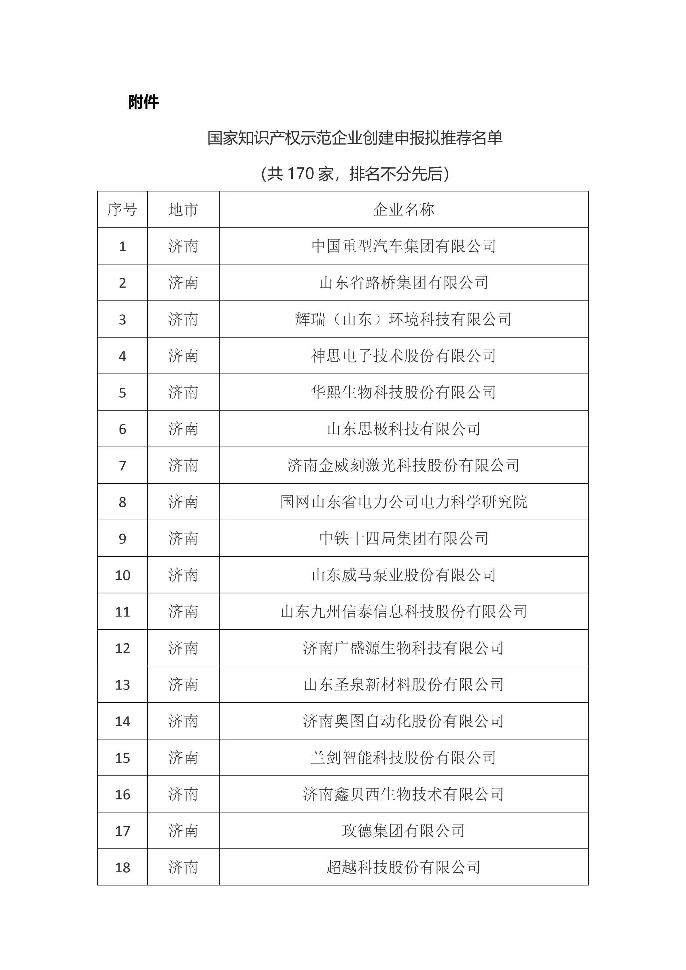 经各市申报推荐、专家评审等程序,拟推荐潍坊市申报国家知识产权强市建设示范市、滕州市申报国家知识产权强县建设示范县、烟台高新技术产业开发区申报国家知识产权强国建设示范园区、济南历城区申报国家知识产权服务业高质量集聚发展示范区、中国重型汽车集团有限公司等170家企业申报国家知识产权示范企业(具体名单见附件)、齐鲁工业大学(山东省科学院)申报国家知识产权示范高校、中国科学院青岛生物能源与过程研究所申报国家知识产权示范科研机构,现予公示,公示期为10月20至22日。