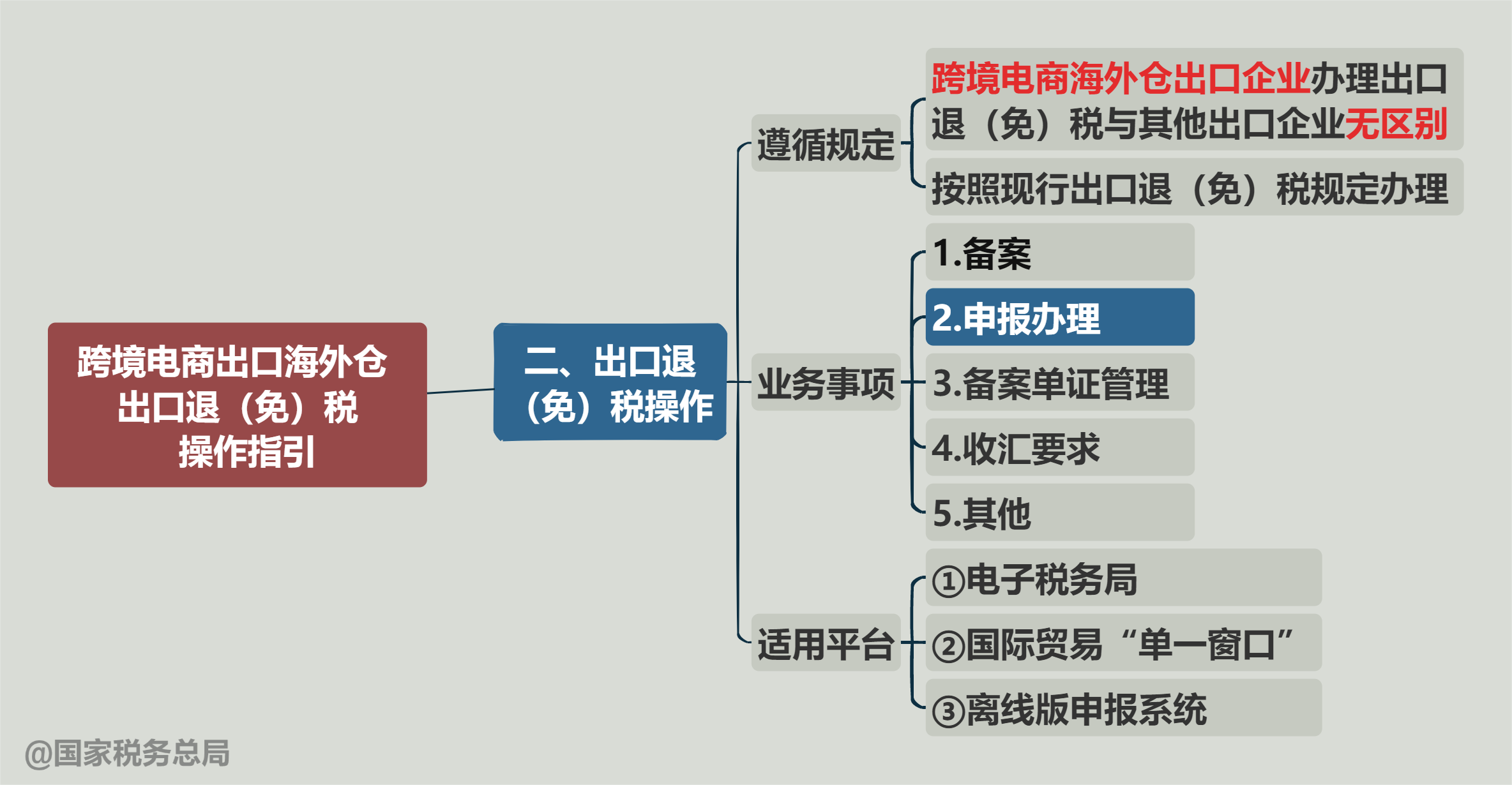 帮助企业深入准确理解出口退(免)税政策规定,熟练掌握出口退(免)税业务办理操作流程,更好地适应行业发展新形势,国家税务总局近日发布《跨境电商出口海外仓出口退(免)税操作指引》,旨在为跨境电商出口海外仓企业提供详实办税指导。我们将指引内容梳理为思维导图,今日发布:跨境电商出口海外仓出口退(免)税操作指引——出口退(免)税申报办理。