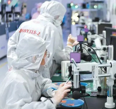位于福建泉州市石狮高新区的福建中科光芯光电科技有限公司生产车间,技术人员在加班加点生产。 新华社记者 魏培全摄