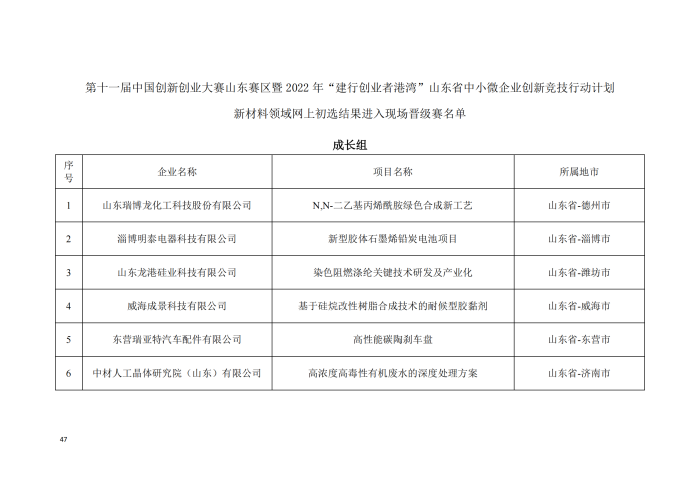 第十一届中国创新创业大赛山东赛区暨2022年“建行创业者港湾”山东省中小微企业创新竞技行动计划网上初选进入现场晋级赛名单