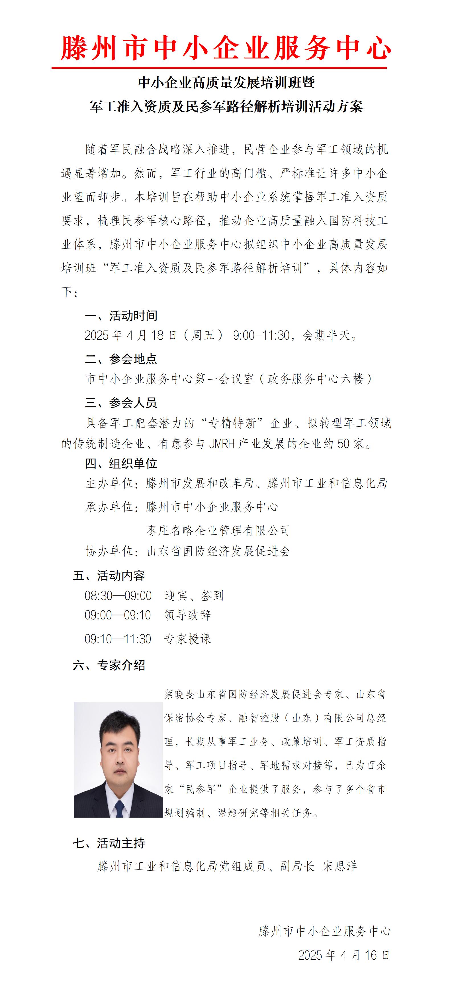 中小企业高质量发展培训班暨军工准入资质及民参军路径解析培训活动
