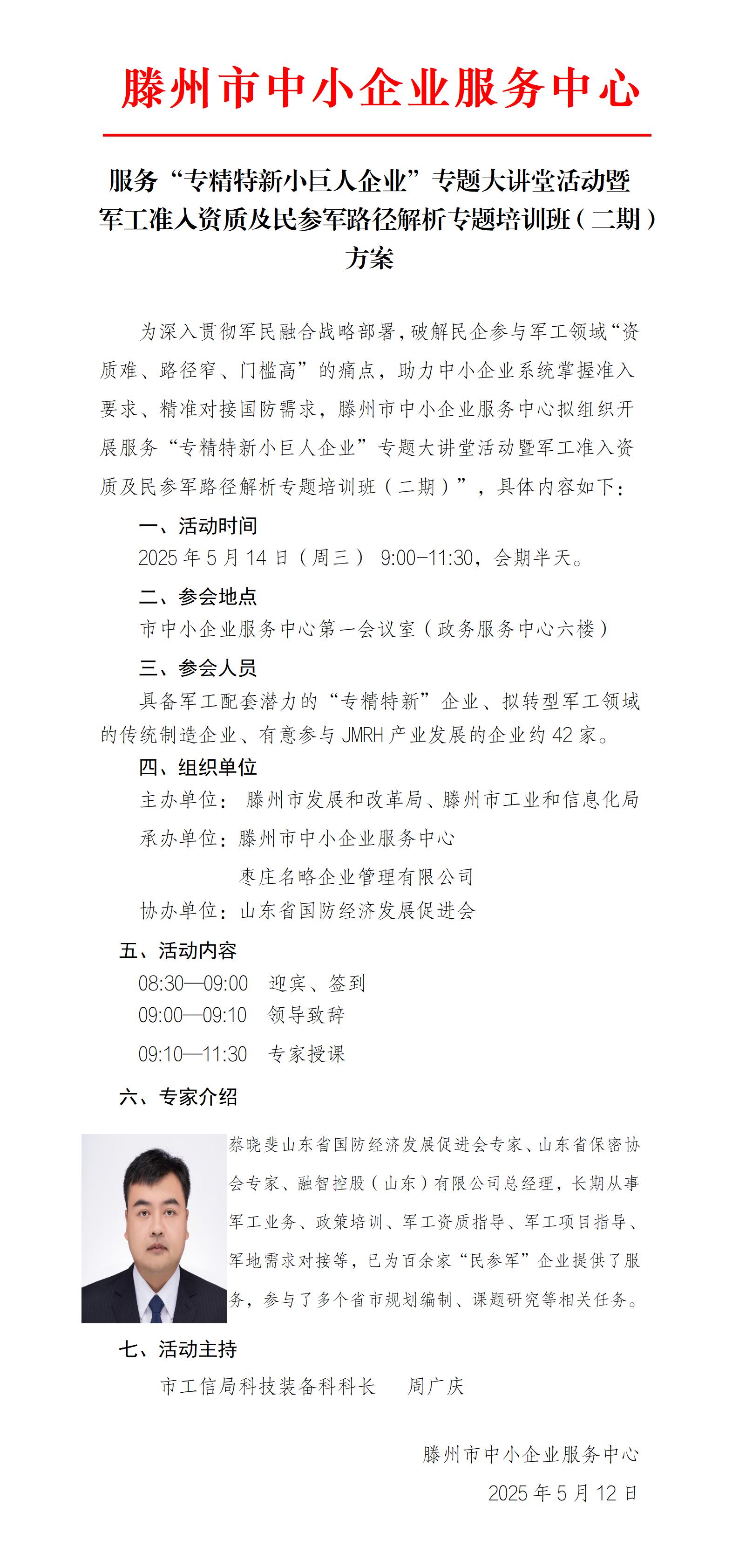 服务“专精特新小巨人企业”专题大讲堂活动暨军工准入资质及民参军路径解析专题培训班(二期)